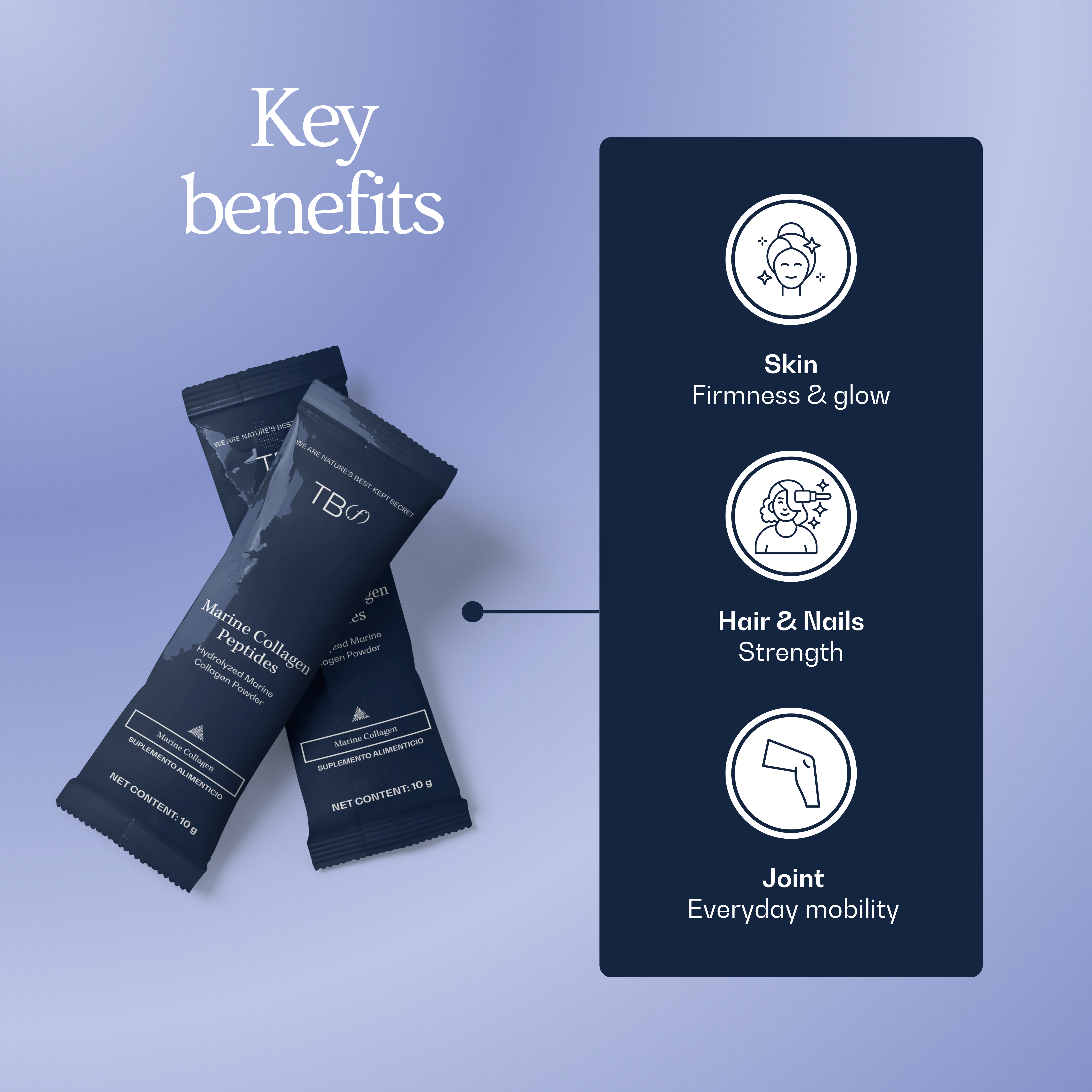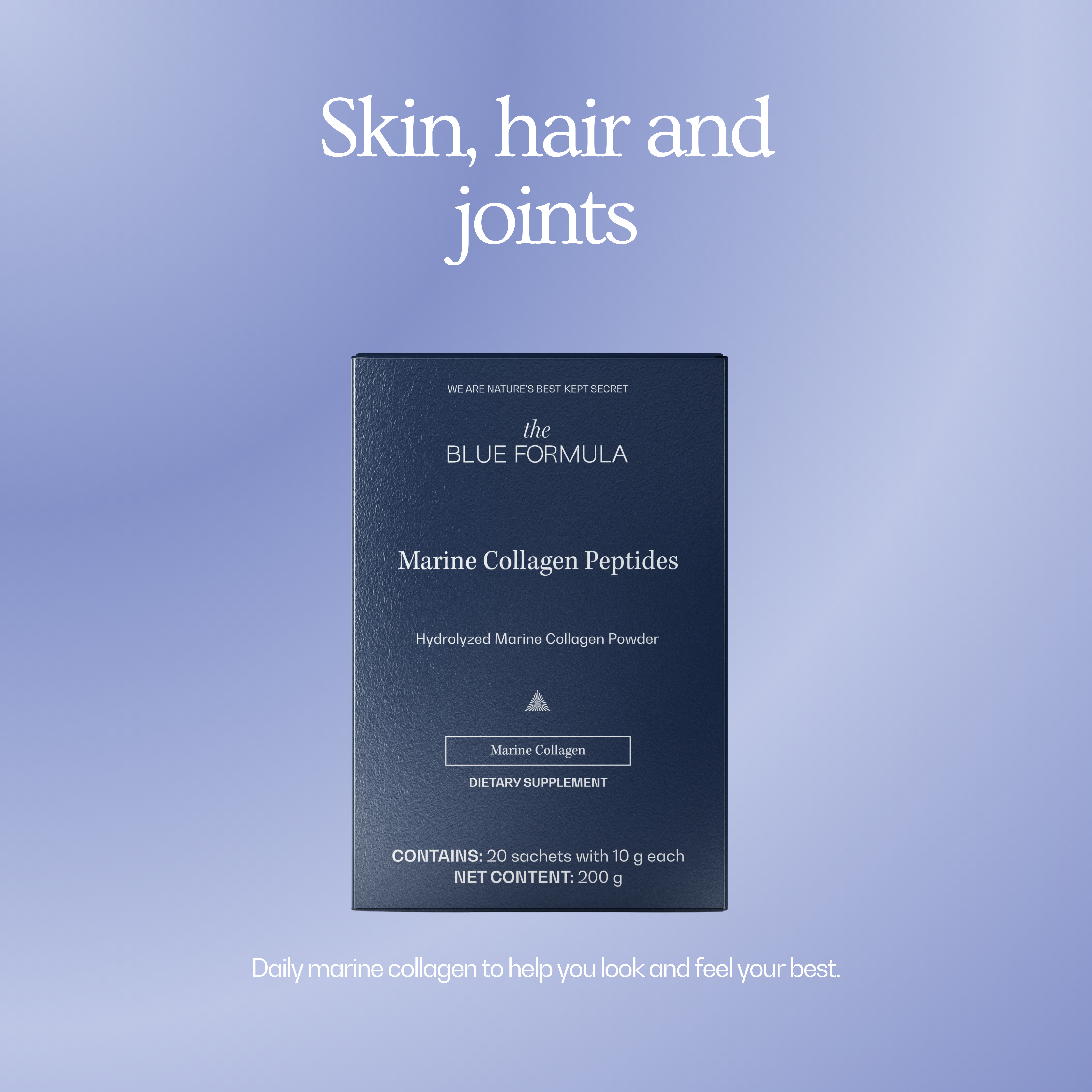 Our original formula delivers 10 g of hydrolyzed marine collagen peptides in every sachet. It’s an unflavored, odorless powder that dissolves easily into what you already drink every day: water, coffee, tea, or smoothies. One simple habit to support glowing skin, comfortable joints, and stronger hair and nails from within.