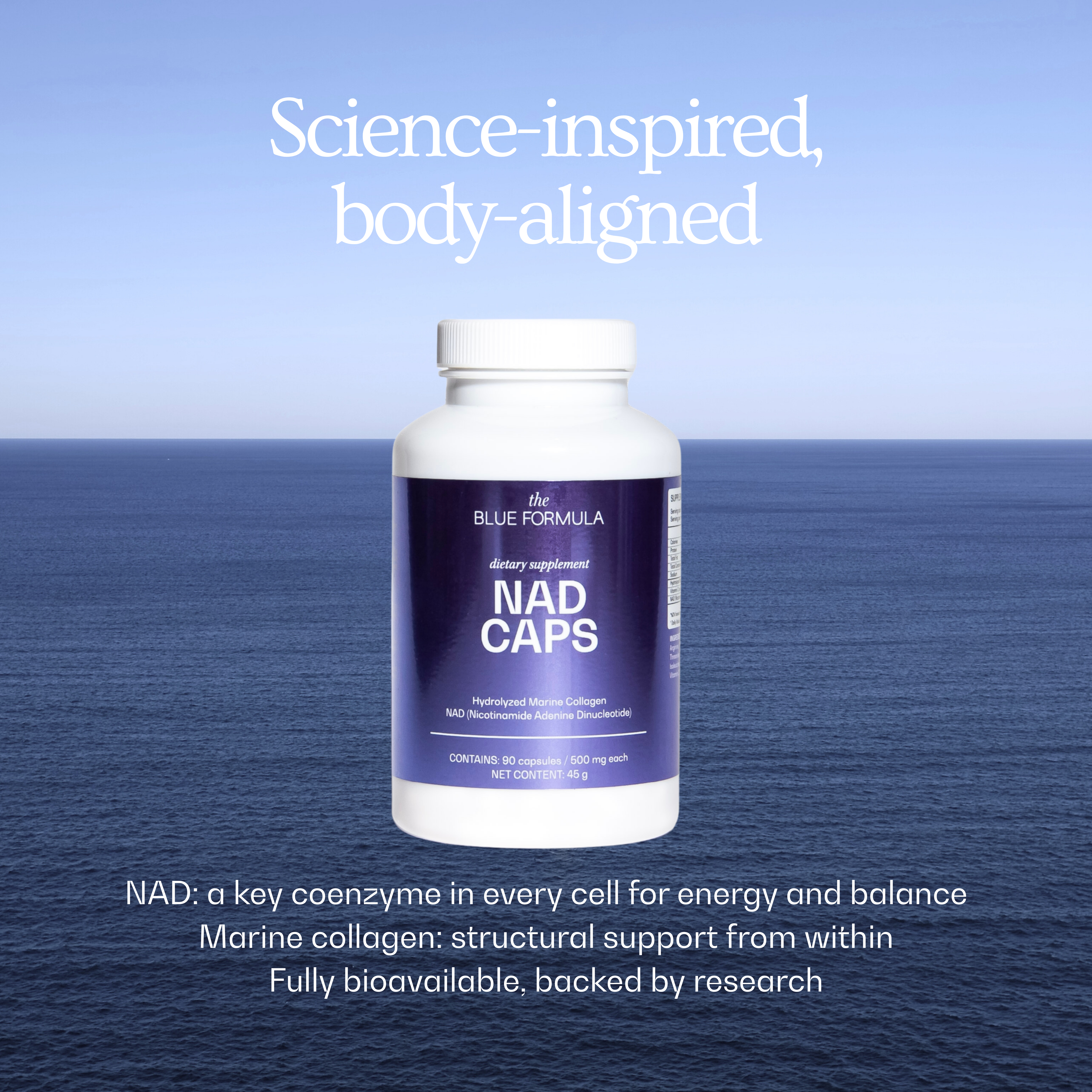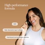 NAD Caps combines NAD+, a coenzyme involved in cellular energy production, with hydrolyzed marine collagen. Together, they support internal processes that show up in how you feel: more vital, more focused, and better able to recover from everyday stress.